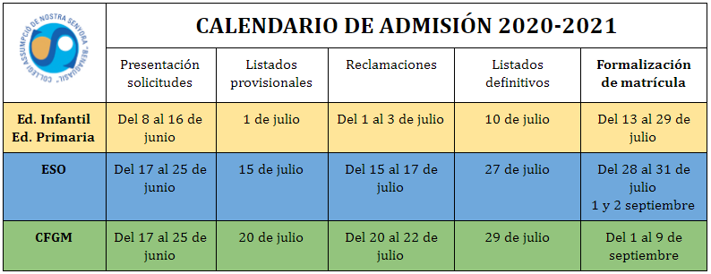 En las próximas semanas dará comienzo el proceso de admisión de alumnado para el próximo curso. Este proceso afecta a todos los alumnos que deseen incorporarse por primera vez a nuestro centro, así como a los alumnos que aunque ya estén matriculados con nosotros, vayan a estudiar el próximo curso 1º de Infantil (3 años) o 1º Ciclo Formativo de Grado Medio (Los alumnos que cambian de etapa de Infantil a Primaria o de Primaria a ESO no deben realizar el proceso de admisión).
